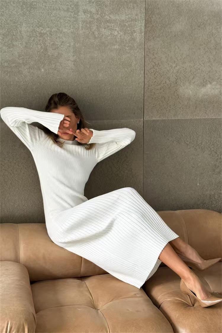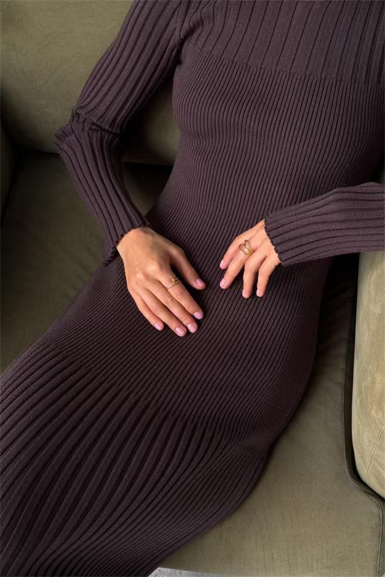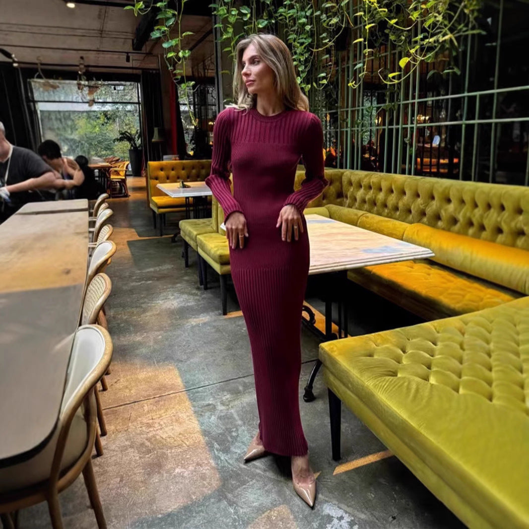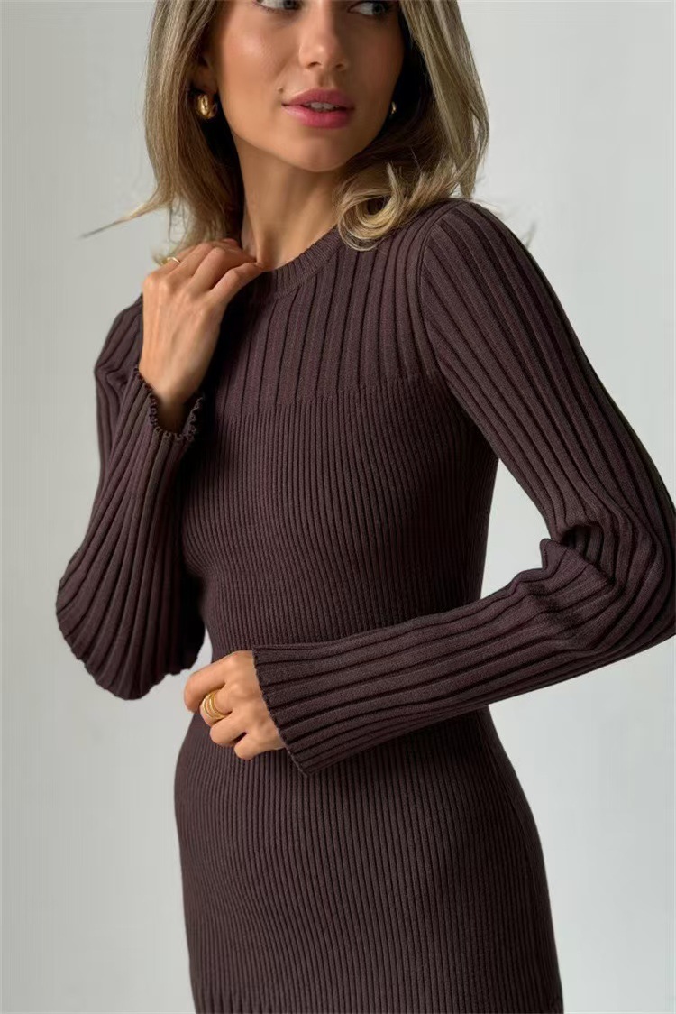 Autumn And Winter Women's Knitted Round Neck Sunken Stripe Pure Color Tight Dress