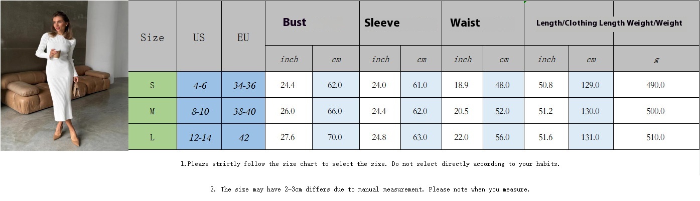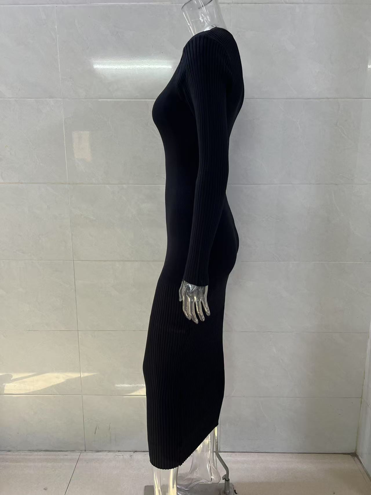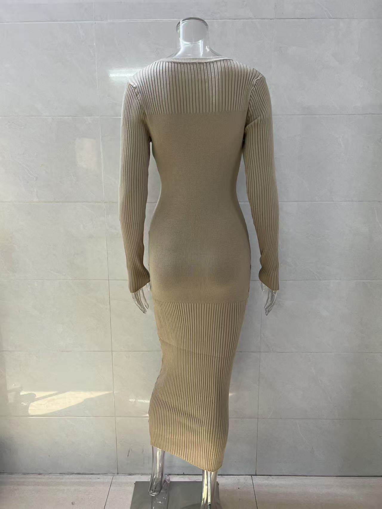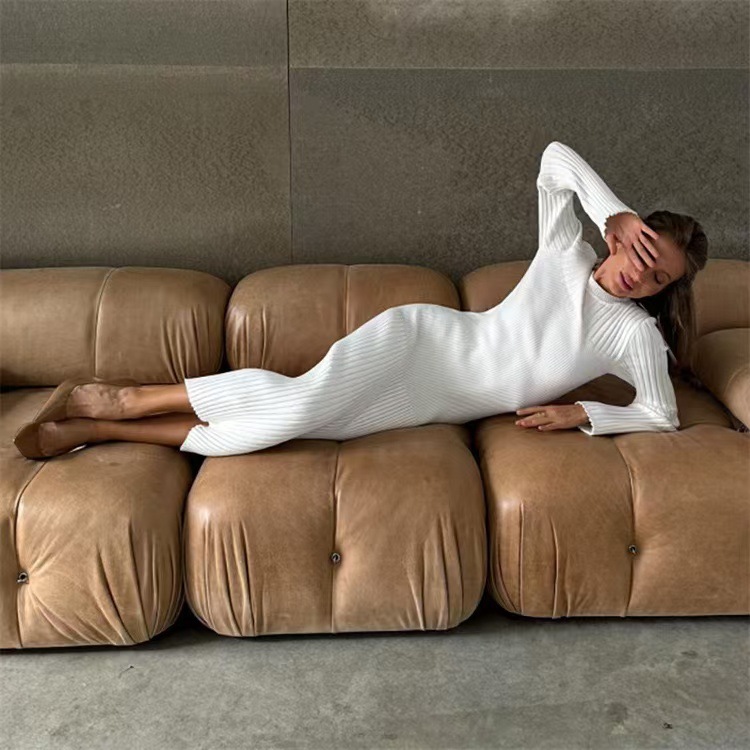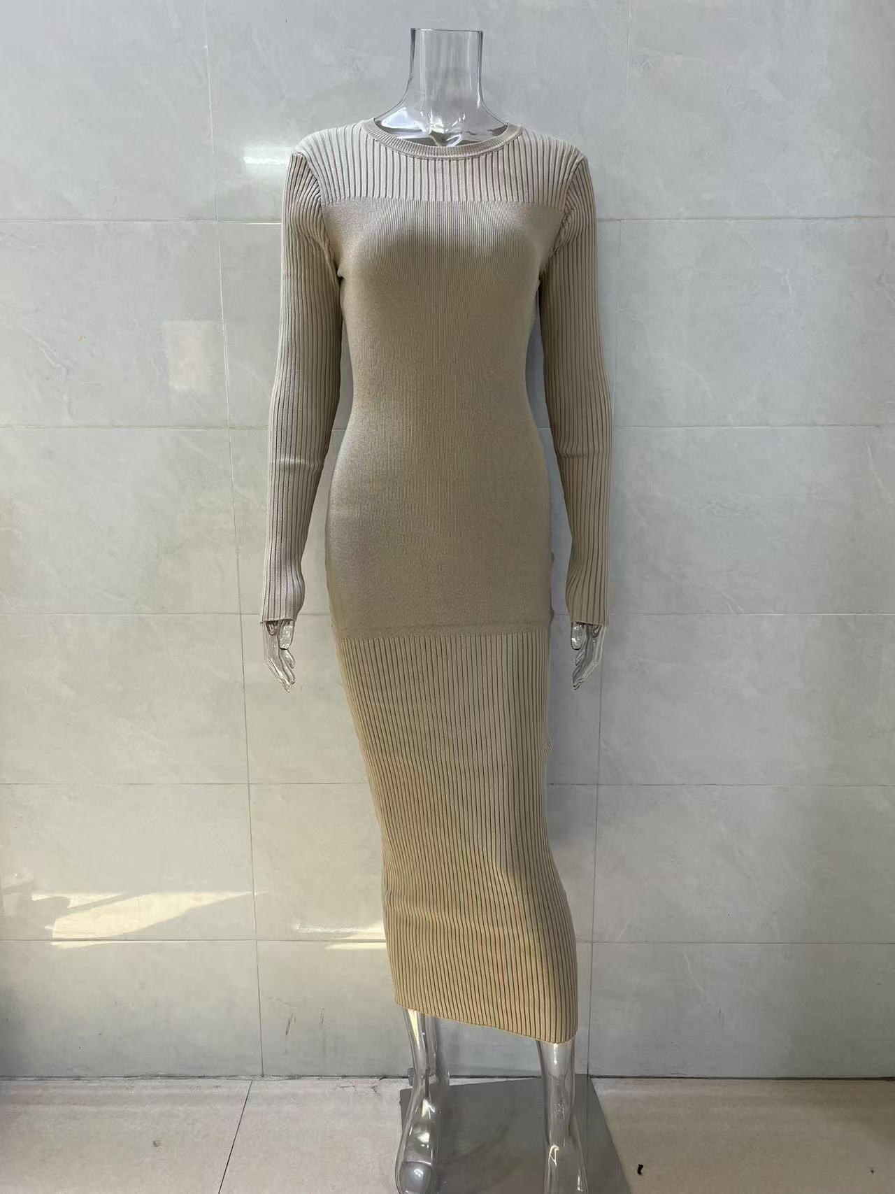 Autumn And Winter Women's Knitted Round Neck Sunken Stripe Pure Color Tight Dress